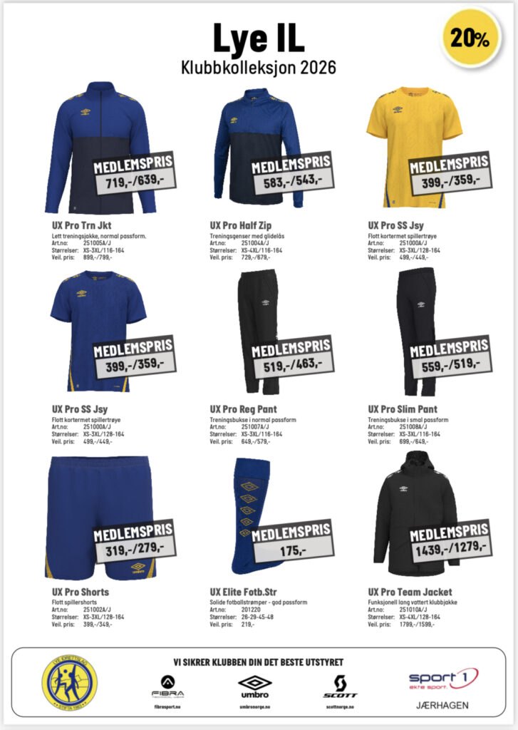 Gjennom vår avtale med Sport 1 Jærhagen, får Lye IL god rabatt på Umbro-produkter klubben treng, som klubbdrakter og div utstyr.