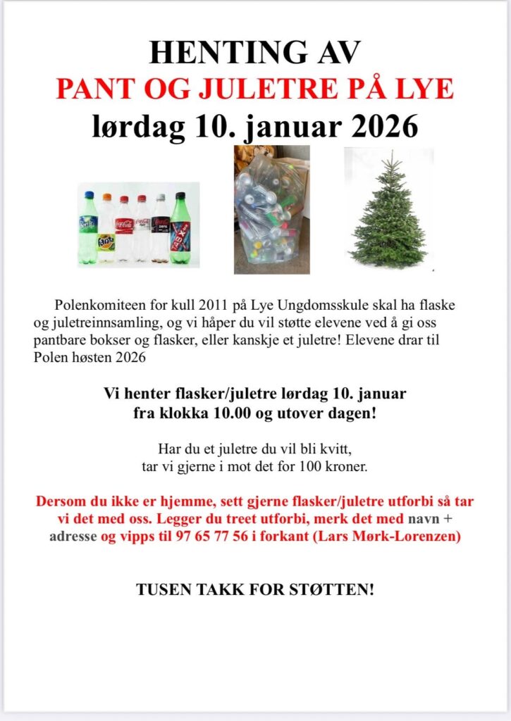 Polenkomiteen ved Lye Ungdomsskule tar nemlig ei runde i bygda 10. januar, for å samle inn ferdigbrukte juletre mot ein liten slant, og tar gjerne samtidig med seg panten din fra jule- og nyttårsfeiringa, til inntekt for nok eit trinn elever som er så heldige å få lov til å planlegge skuletur ila 10. klasse! ✨